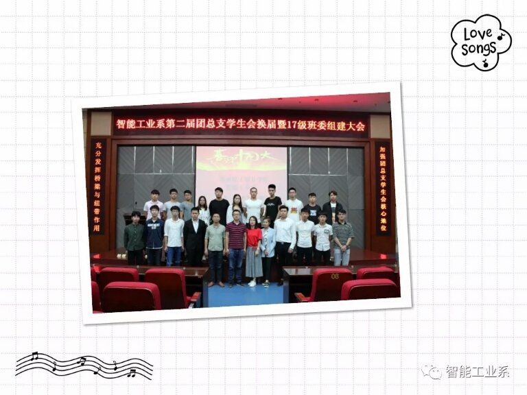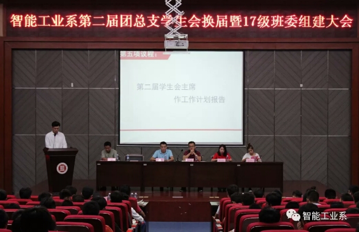 2017年10月19日七点,第二届智能工业系团总支学生会换届暨17级班委组建大会在行政大厅四楼学术报告厅隆重举行。智能工业系蔡荣盛主任、学院学生处许新建处长、院团委张丹书记、智能工业系党支部马健锋副书记、智能工业系团总支杨慧婷书记、智能工业系组织委员何婷婷老师、各系团总支副书记、学生会主席、智能工业系团总支学生会第一届主要学生干部、第二届全体成员以及16 17级主要班委参加本次大会。会议由智能工业系党支部马健锋副书记主持。主要有三大阶段、九大议程。
