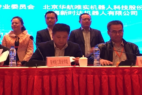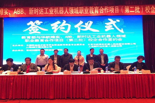 11月6日,我院副院长何世伟博士应邀赴常州参加教育部与华航唯实、上海ABB工程有限公司、新时达工业机器人领域职业教育合作项目校企合作签约会并成功签约教育部工业机器人领域职业教育项目合作院校,顺利获得项目合作方向我院赠送的价值约300万元人民币的实训设备、教学资源、软件平台以及师资培训服务。
